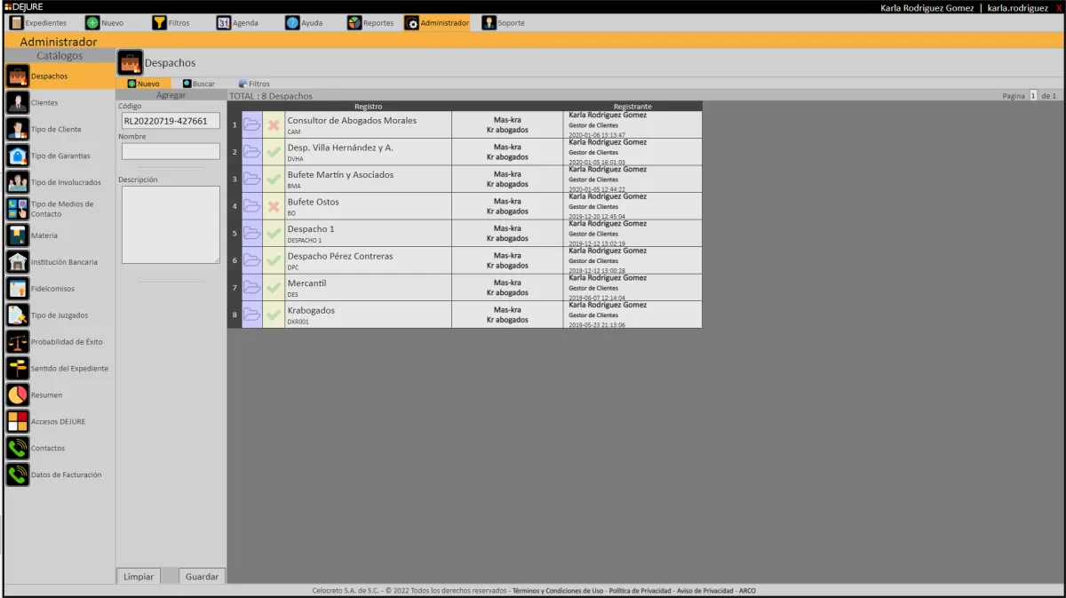 Gestiona tu despacho, tus clientes, el tipo de garantía, tipo de involucrados, tipo de contacto y más.